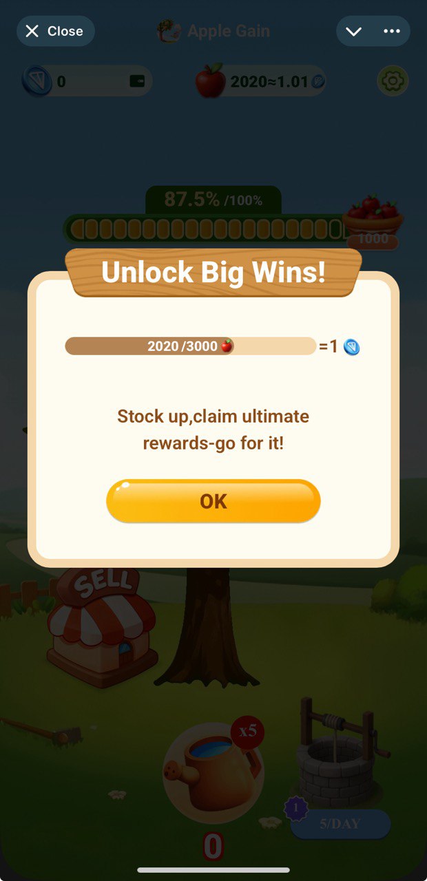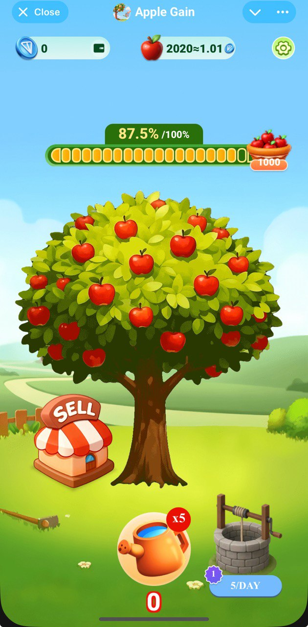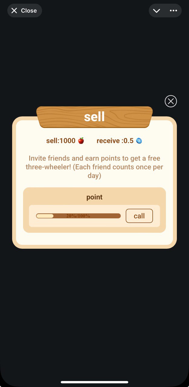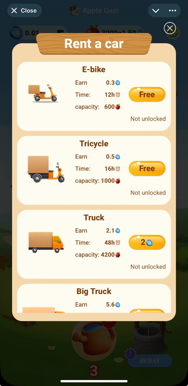 $TON staking app. One should farm enough apples first in order to start 'transportation to market' which will yield you some $TON as result. By moment of publication you can go for both free and paid paths: refer friends to unlock free transport or stake $TON to rceive more after a short period.