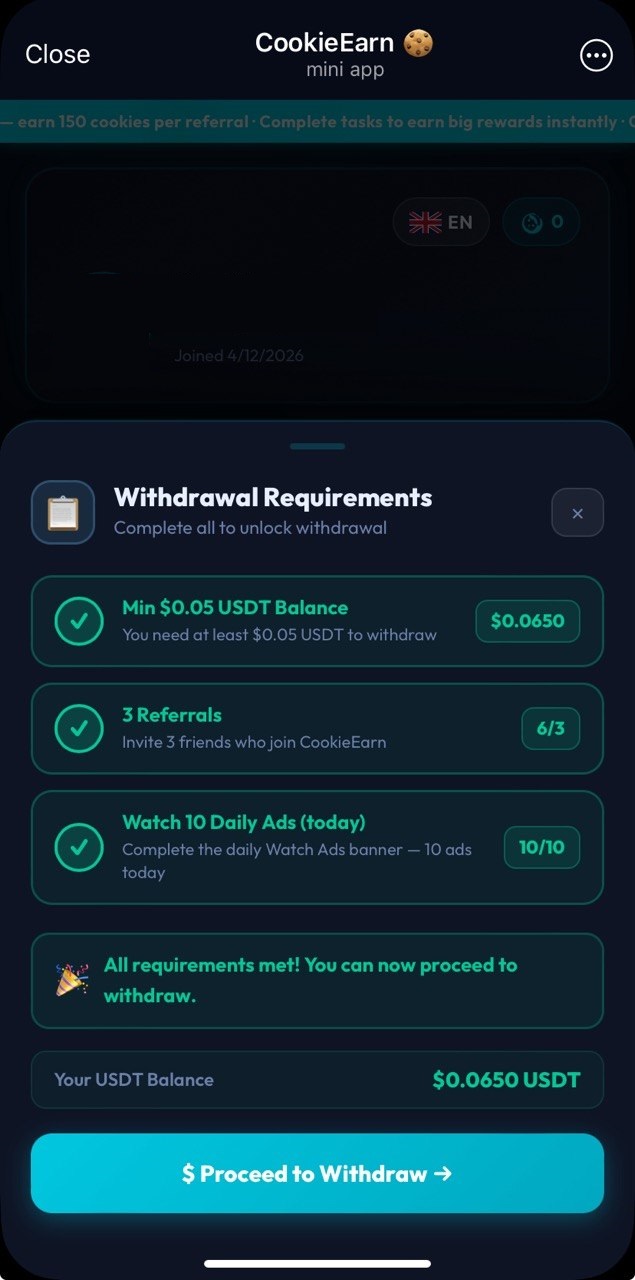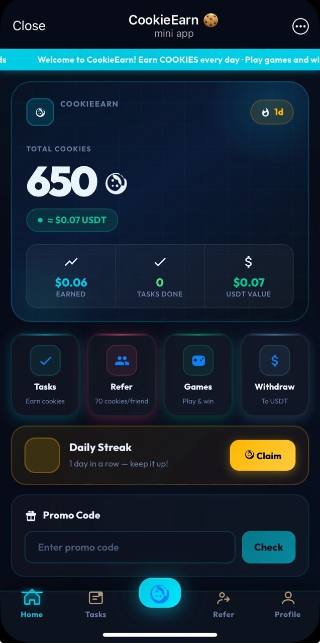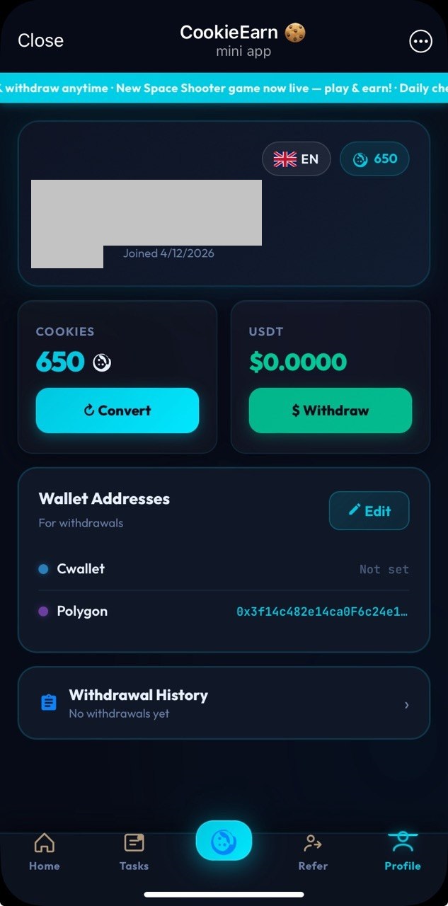 Project is very similar to PawRush bot (and these both are from the same dev đ): watch ads, complete some tasks and withdraw $USDT (Polygon network) đē. You earn in-game currency "cookie" at first though, which is swapped to $USDT at 100 cookies = 0.01 $USDT rate. Pay attention to that there is referral invite condition.
