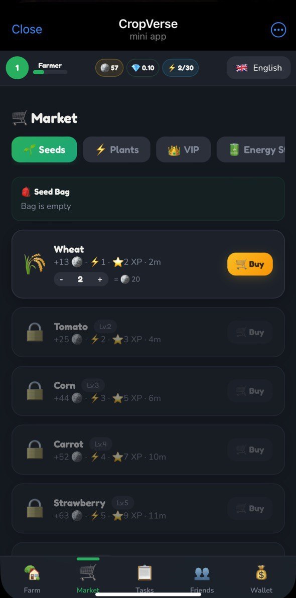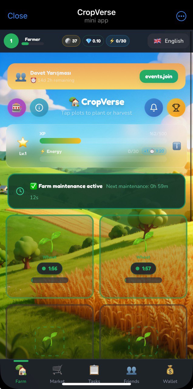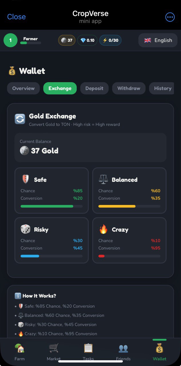 Some interesting mechanics here, though I am not sure if it's new: purchase crops for gold, grow them, sell your harvest for gold, exchange gold to $TONπ and withdraw π Important points: β‘οΈ Your gold swap can fail with certain chance and it will disappear. That's insulting but fun π β‘οΈ First withdrawal is free of conditions, for further ones you have to reach level 3 in-game. Levels are determined by XP points you receive from collecting your harvest