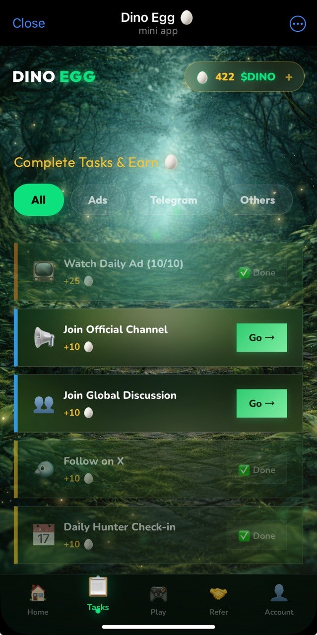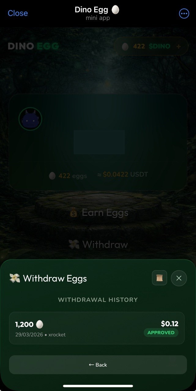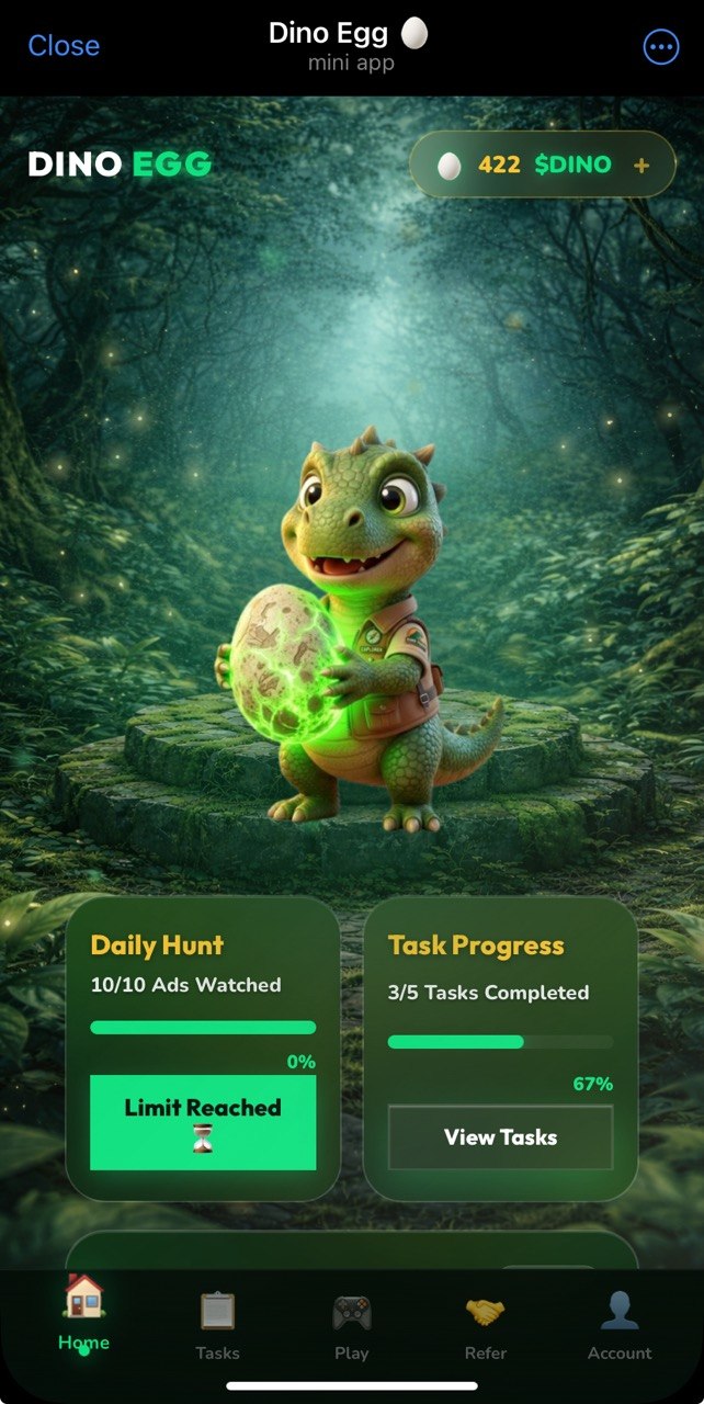 Dino ads clicker app β watch eggs ads, collect eggs ($DINOπ₯) and withdraw via either xRocketπ or CryptoBotπ€ or directly as $USDT BEP20. A couple of mini-games present, so that you can earn even more π βΉοΈ Important withdrawal notice: one should watch 10 ads in the past 12 hours and invite at least 2 referrals (lifetime, no time window).