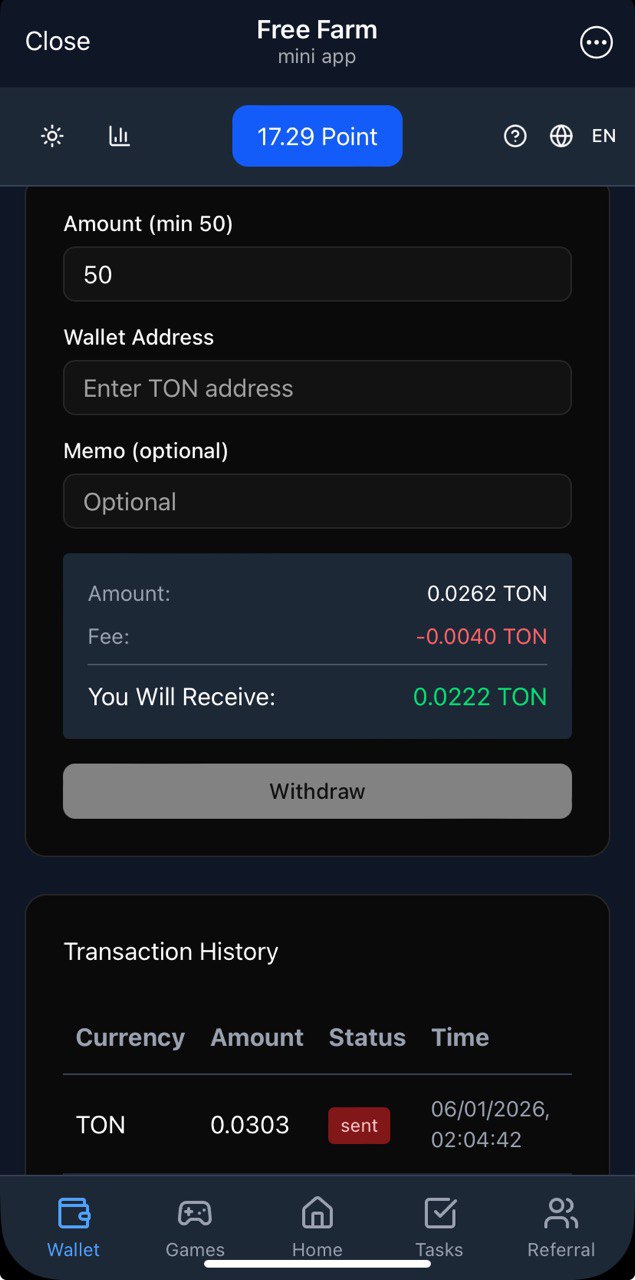 | đ° Min. withdrawal | 0.0683 | $TON (TON) | |
