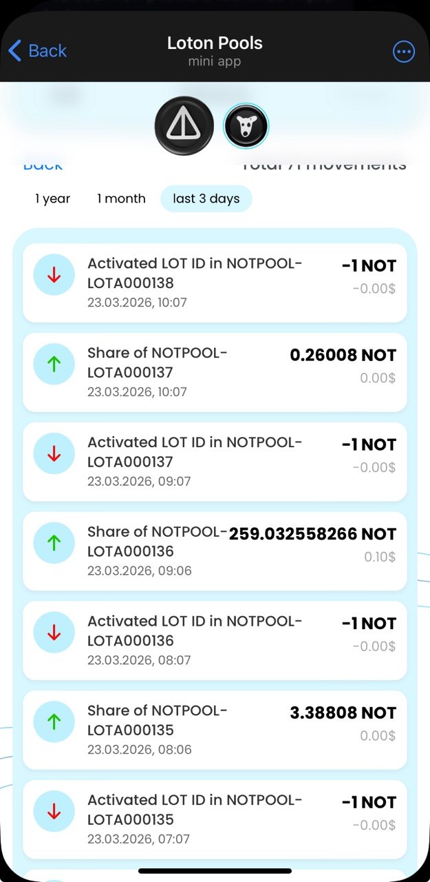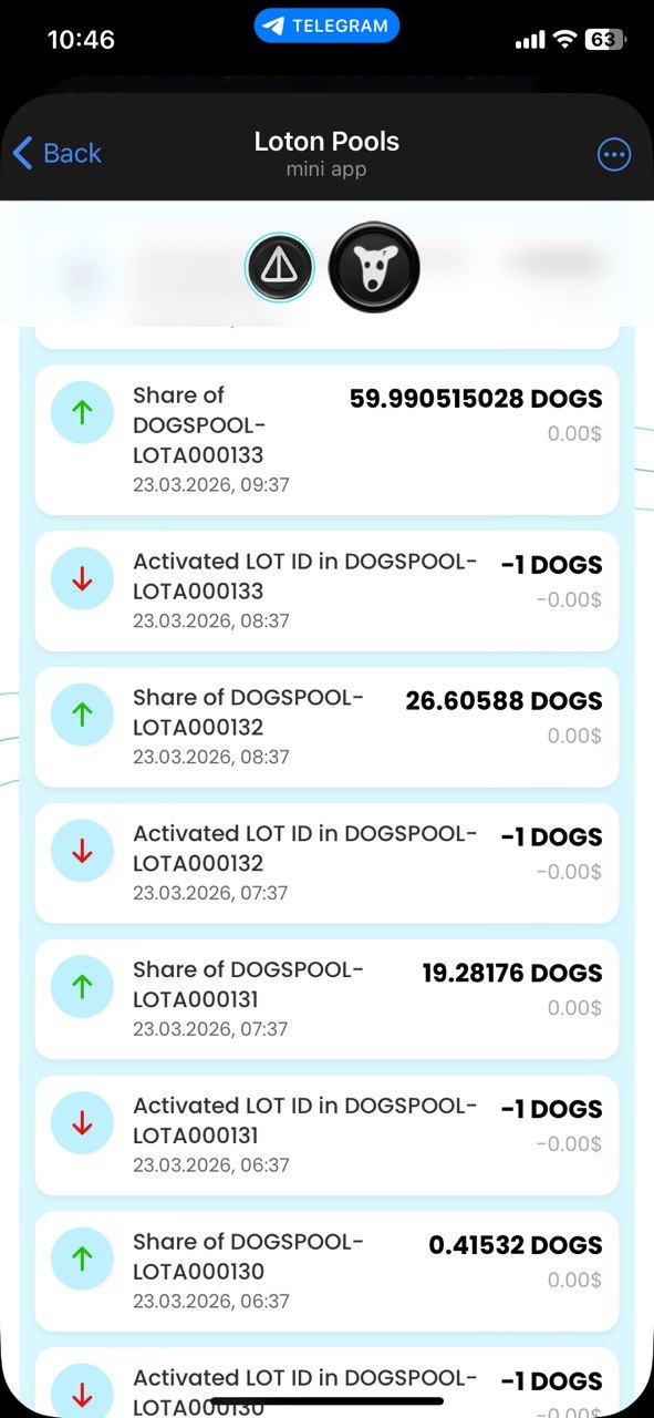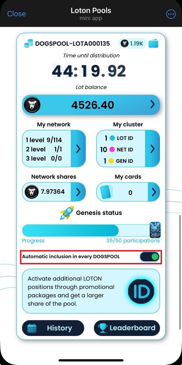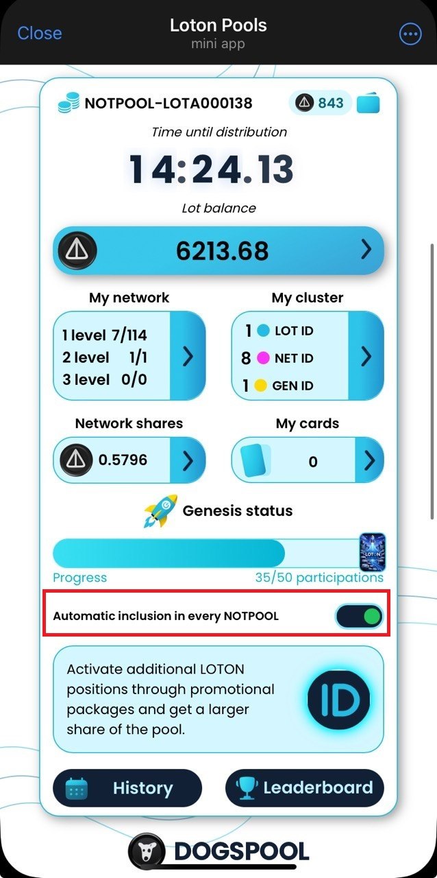 Participate in hourly "distribution pools" with different currencies (tokens): $NOT, $DOGS, $TON, $USDT and etc. These pools are more like lotteries: you enter pool with one ticket. The more referrals and genesis cards you have, the more chances for you to win big! But keep in mind, that usually you don't win big and even lose. But that's how lottery works.