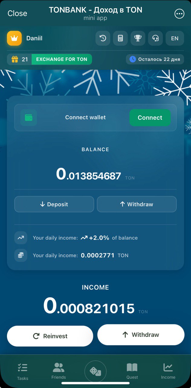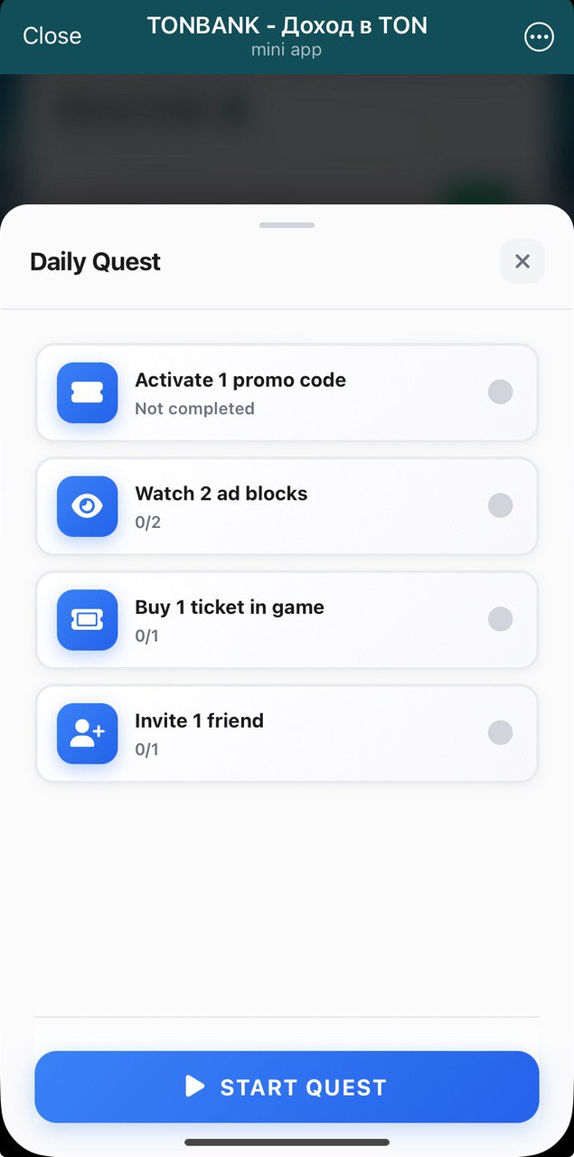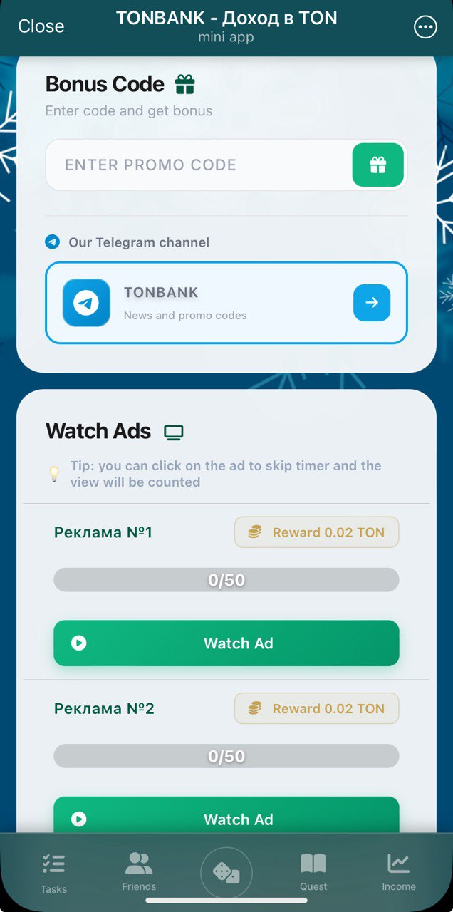 Earn passive income by just holding funds at your in-game balance. But you don't have to deposit: mini-app provides way to earn for free. Watch some ads, enter free $TON-yielding promocodes and do daily tasks. You also get a little interest on your invited friends' balances, not much but still something 😊