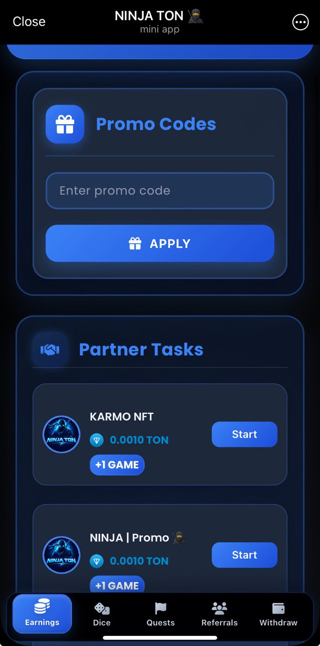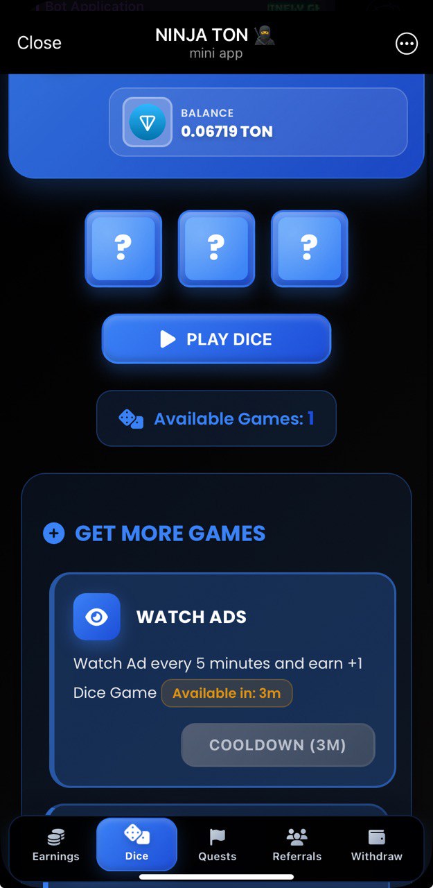 Gamified ads clicker and task completions app here. Earn dice rolls for watching ads and doing tasks. Dice rolls bring you rewards in $TON and it isn't dust amounts compared to other "dice roll" apps we have seen before. Do some subscription tasks to maximize your earnings!