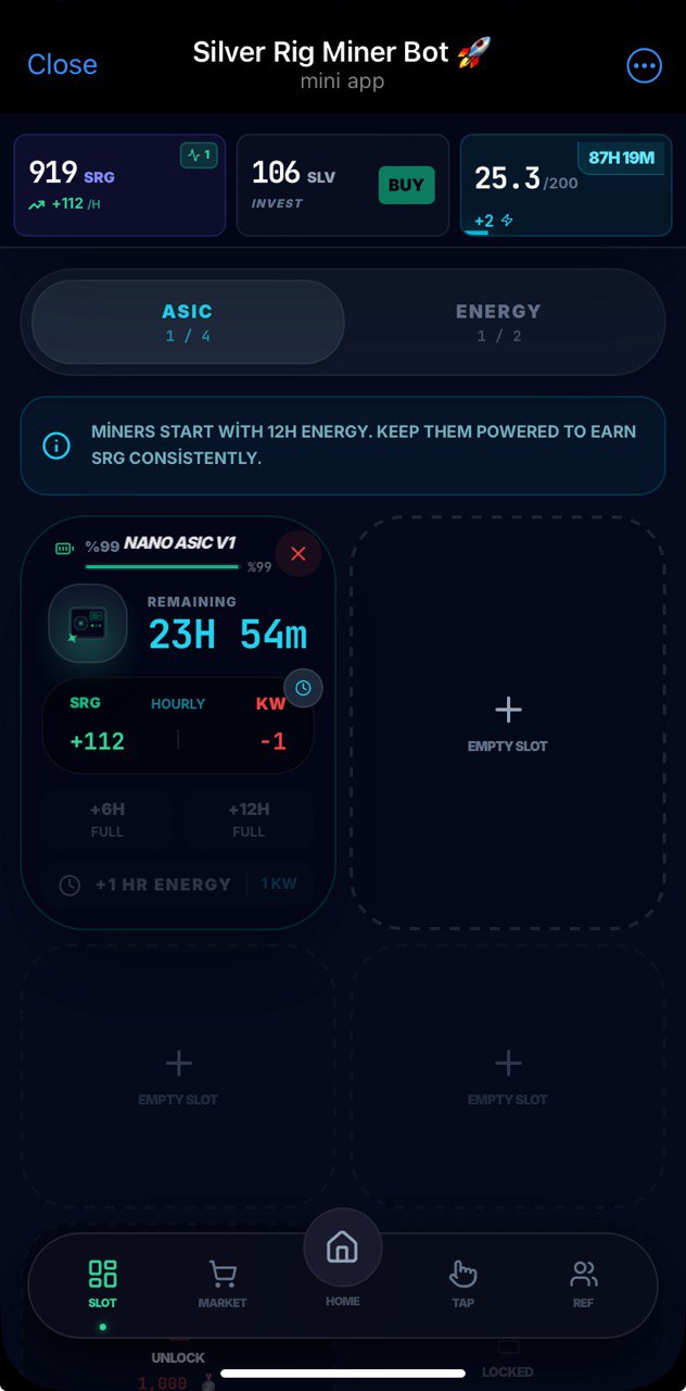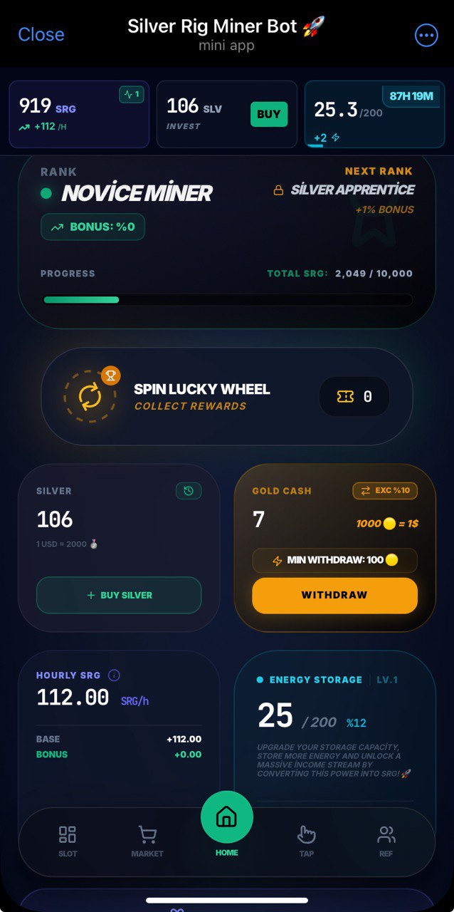 Well known "mining" approach: purchase miners and energy producers with silver, mine SRG and exchange it to silver and withdrawable gold đĨ Free earnings are possible here and as far as I understood one doesn't have to deposit: you can just watch some ads instead. And for watching ads you also receive spin tickets, which bring you additional rewards â double profit!
