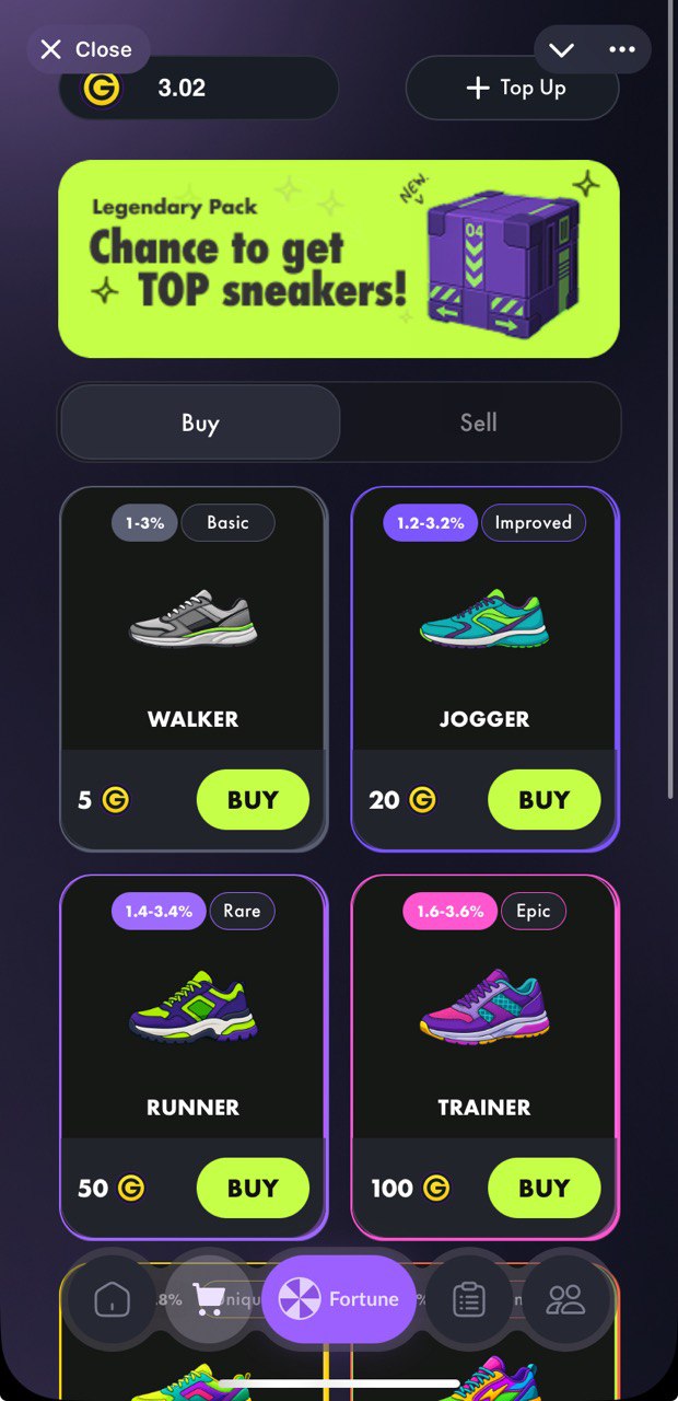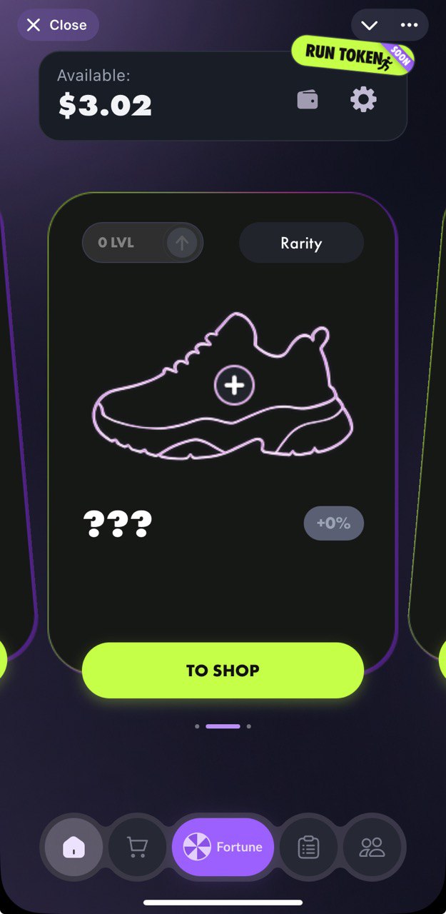Buy some sneakers and watch your balance grow. I don't clearly understand how it works here, there is no clear explanation presented. But there is illusory hope that you can earn enough coins for your first sneakers (which cost 5 $USDT) via daily spin roulette.