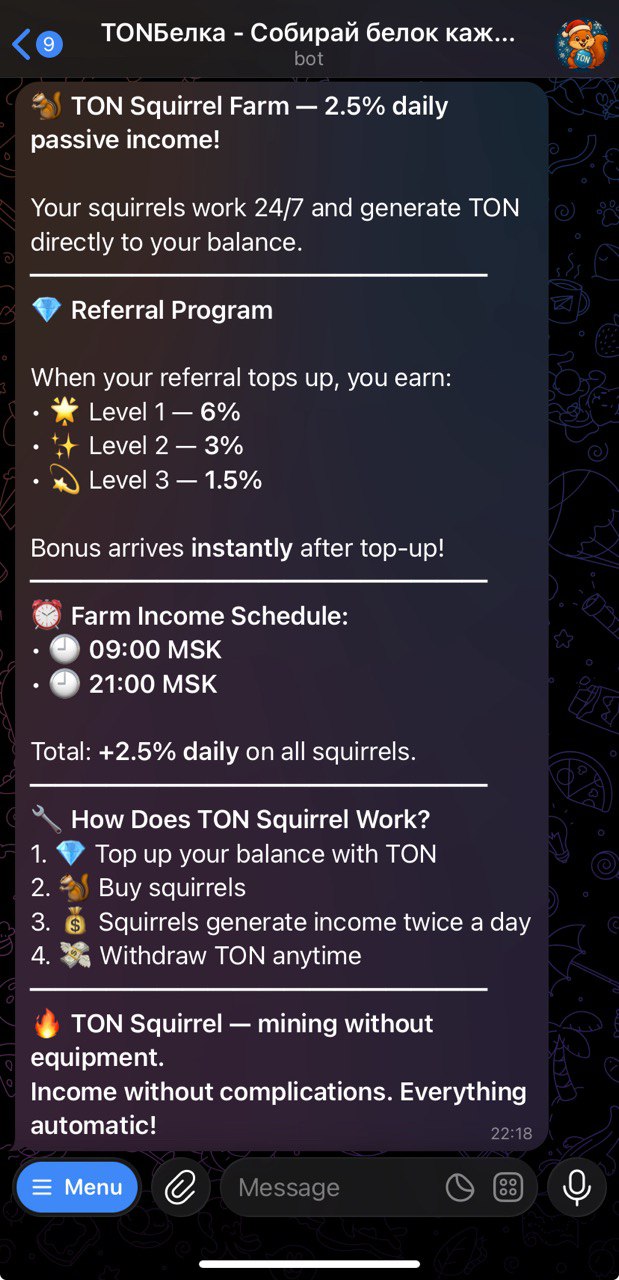 Requires investments! Spend some $TON to get yourself a squirrel, which will bring you certain interest accrual every day. You can also utilize promocodes feature in order to receive small free $TON rewards daily.