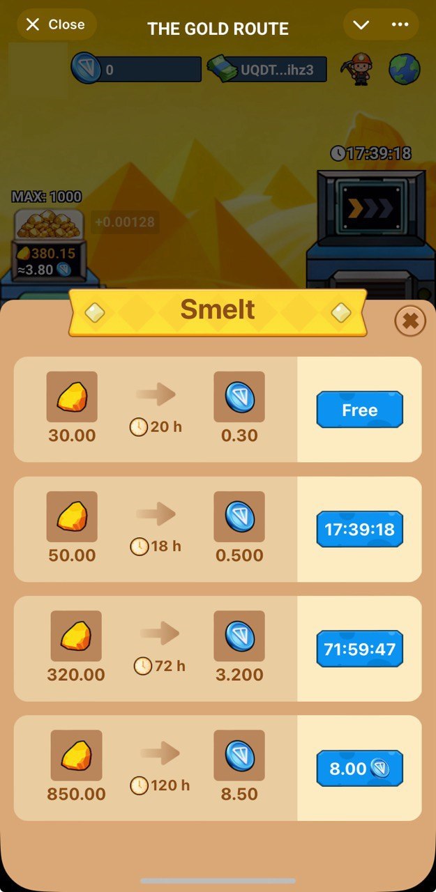 Farm gold and smelt it into $TON! Invite more friends to farm more gold and smelt it into more $TON correspondingly! There are paid and free options to produce $TON, exact values are subject to change, make sure to check them out inside bot.