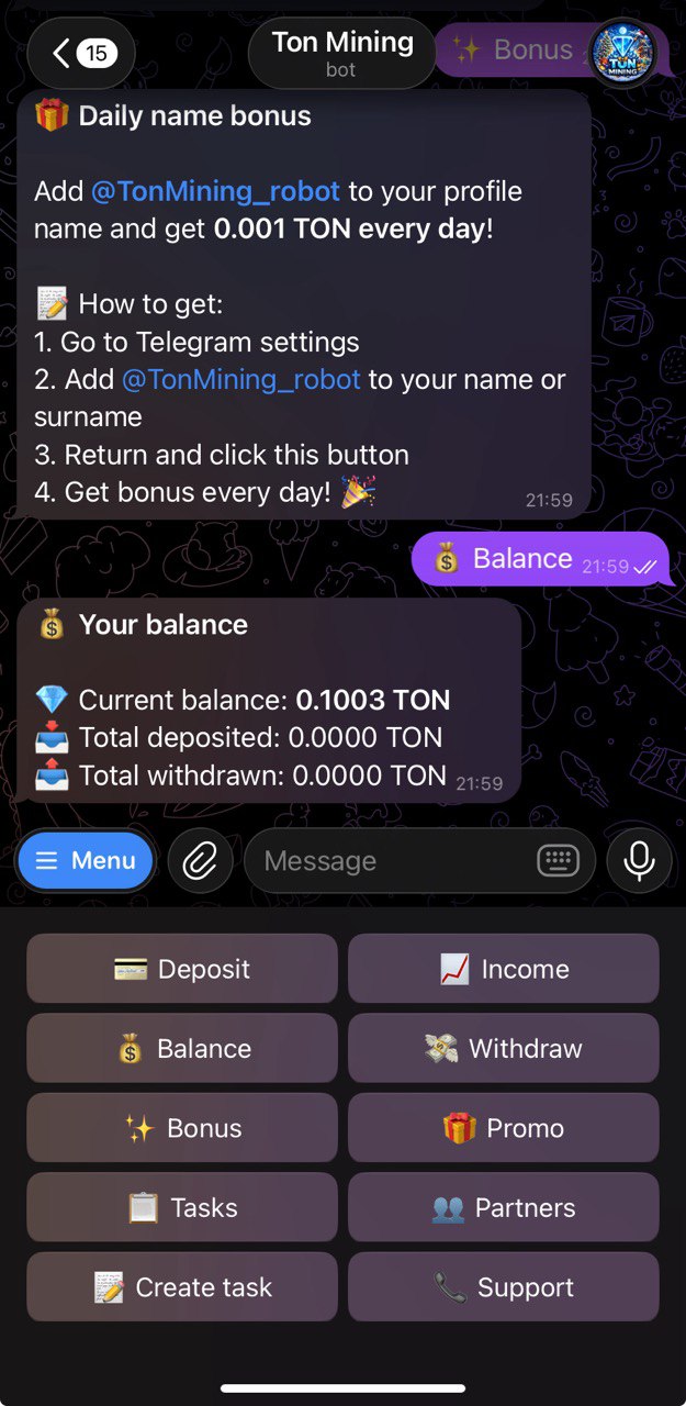 Another idle mining app is here: login daily, collect your mined $TON and withdraw (similar mechanics to already scammed TonWin, TonRush and some other projects). It appears, that no deposit required to unlock withdrawal feature, so we can try going free way here. You can also do some tasks here to increase your mining output. You receive 3% daily accrual on your balance. You can change language by using /lang command inside the bot.