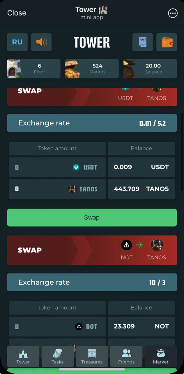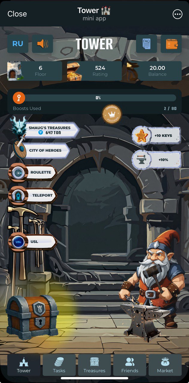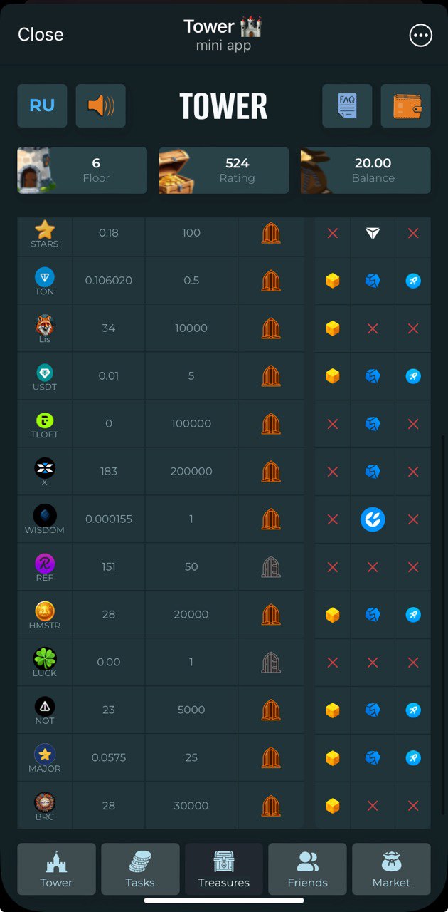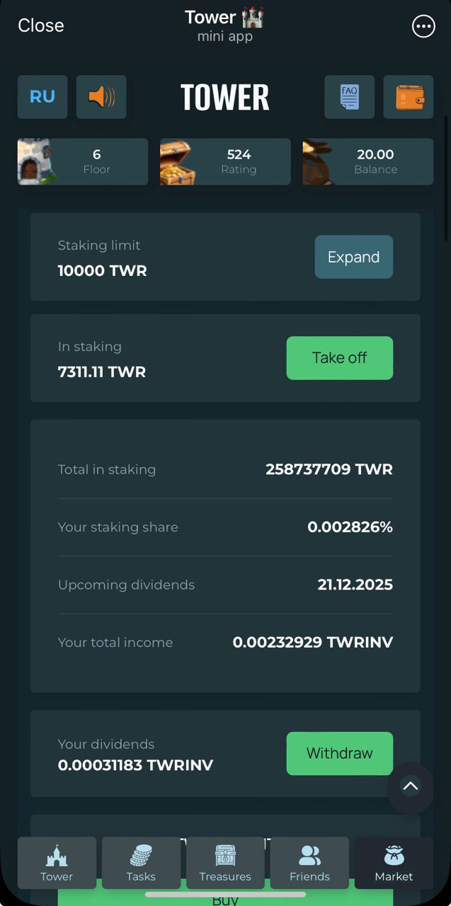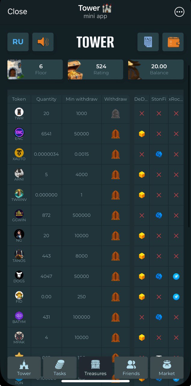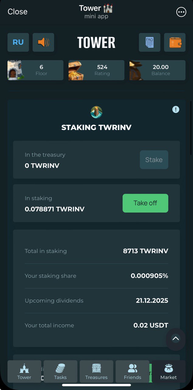 Collect your daily keys and open chests. Chests yield variety of tokens, including $TWR - internal project token. Use it to climb up higher floors which yield even more rewards. There are plenty of different tokens here. They can be divided into 2 groups: rewarding tokens and staking tokens. Rewarding are to be collected and withdrawn (withdrawal minimums are quite high). Staking tokens can put to stake just inside the application and generate real $USDT income. Project offers mid-term opportunities to earn, no fast money here.