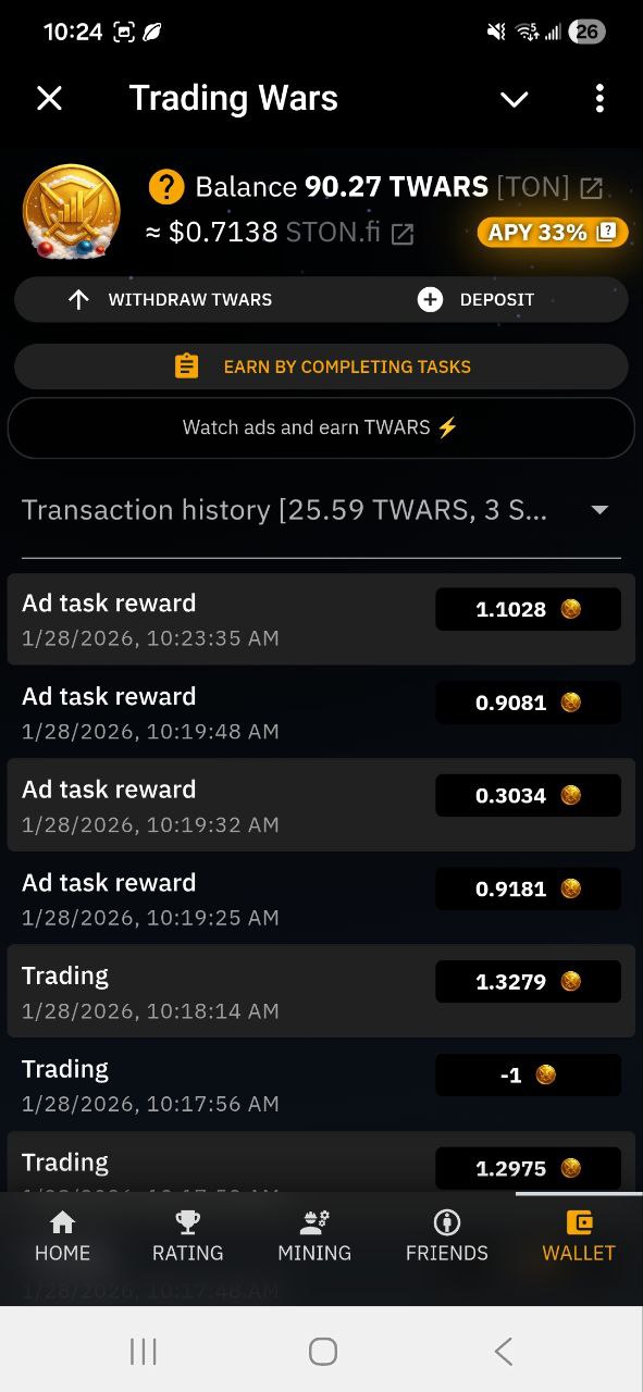 Cool bonuses are given for inviting friends, spinning the wheel every few hours and even staking rewards when you hold 10 TWARS or more in your in-game wallet. Withdrawals are sent directly to your connected wallet with a small, fixed fee of 9 stars.