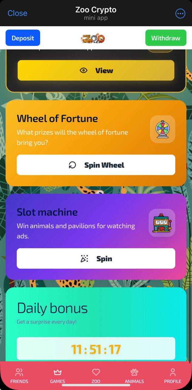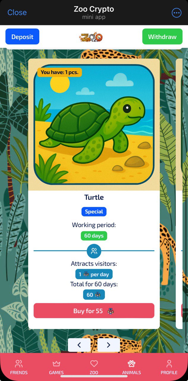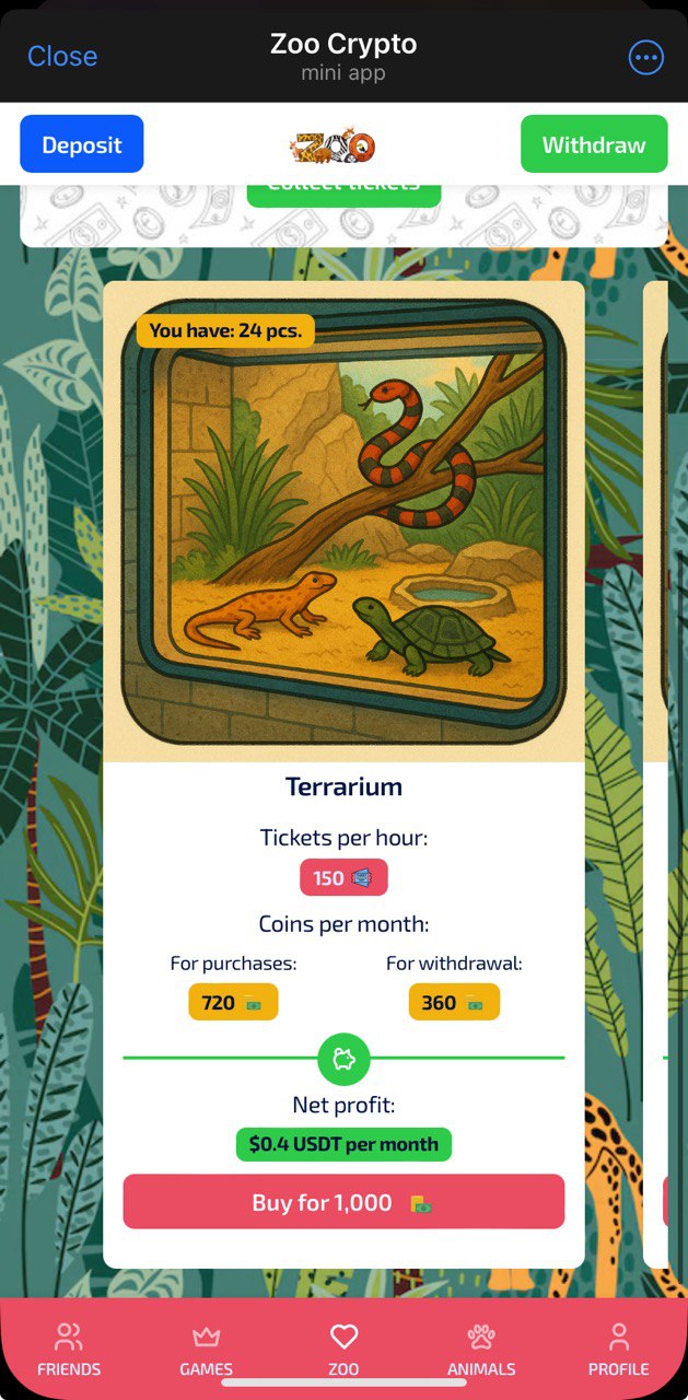 Get yourself some animals, which will bring you coins and visitors. 1,000 withdrawable coins equal 1 $USDT. But there is an important notice here: you require 1,000 visitors per every 1,000 withdrawable coins. And visitors are way more harder to receive. Primarly, you can get them from watching ads, but it might take pretty much time, be advised.