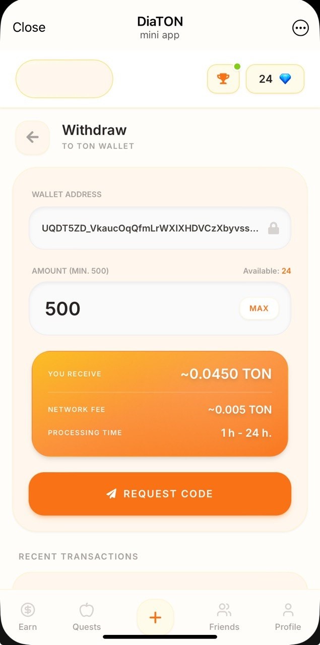 Classical "bux" system is here: watch ads, complete tasks, invite friends and receive diamondsπ for it. Exchange rate at the moment of publication is 100π = 0.01 $TON. Minimum withdrawal is 500π (0.05 $TON) with extra 0.005 $TON fee.