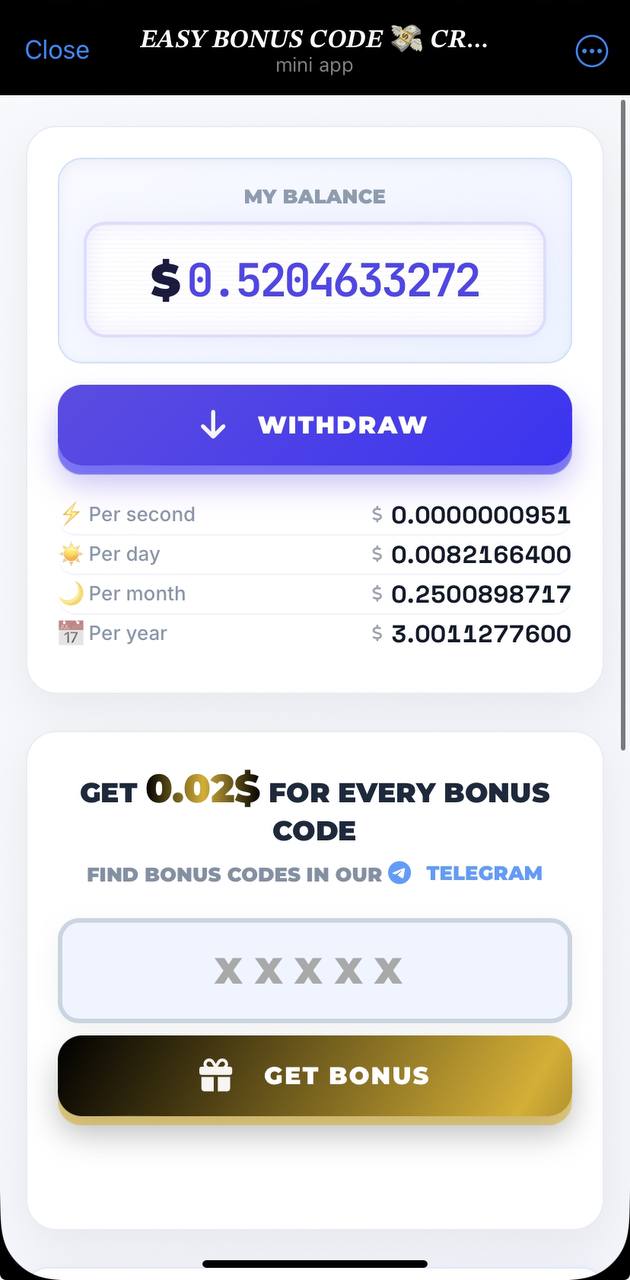 Developer of 100 Levels and Crypto Gold apps has issued new bot where he promises that we can earn some free $USDT by using daily codes đĨ It sounds too sweet for me, but developer guy pays in all his projects as far as I am acknowledged, so I expect no any sort of fraud here.