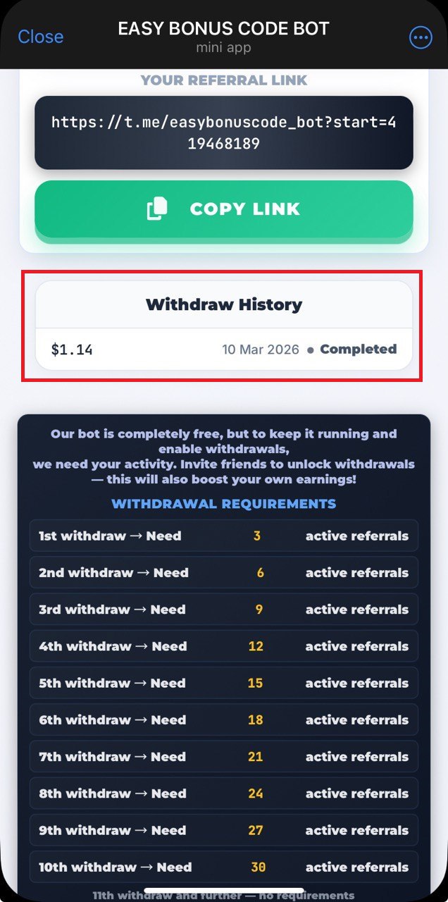 | Arbitrary | Active referrals are requried for withdrawals. For further details please refer to corresponding table inside the app. |