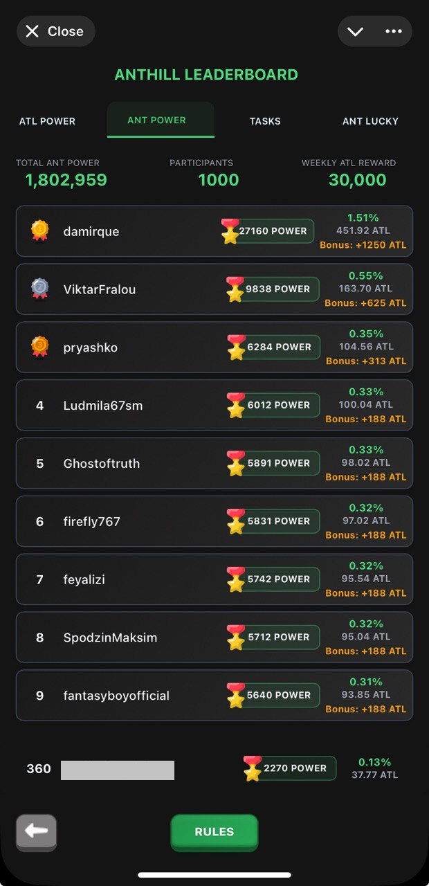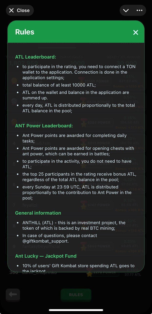 Auto-battler game is here: arm yourself with best equipment, climb the leaderboards and catch your chance to win some $TON for prize places. App is not something new and many of you might have already seen it. What drew my attention now is collaboration with AntHill: now we can farm some $ATL tokens just inside Gift Kombat by playing and doing simple tasks đ $ATL is a rewarding token (like $MPAK) and if I understood correctly you can receive $TON rewards for holding $ATL at your wallet, sweet deal