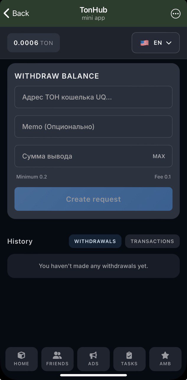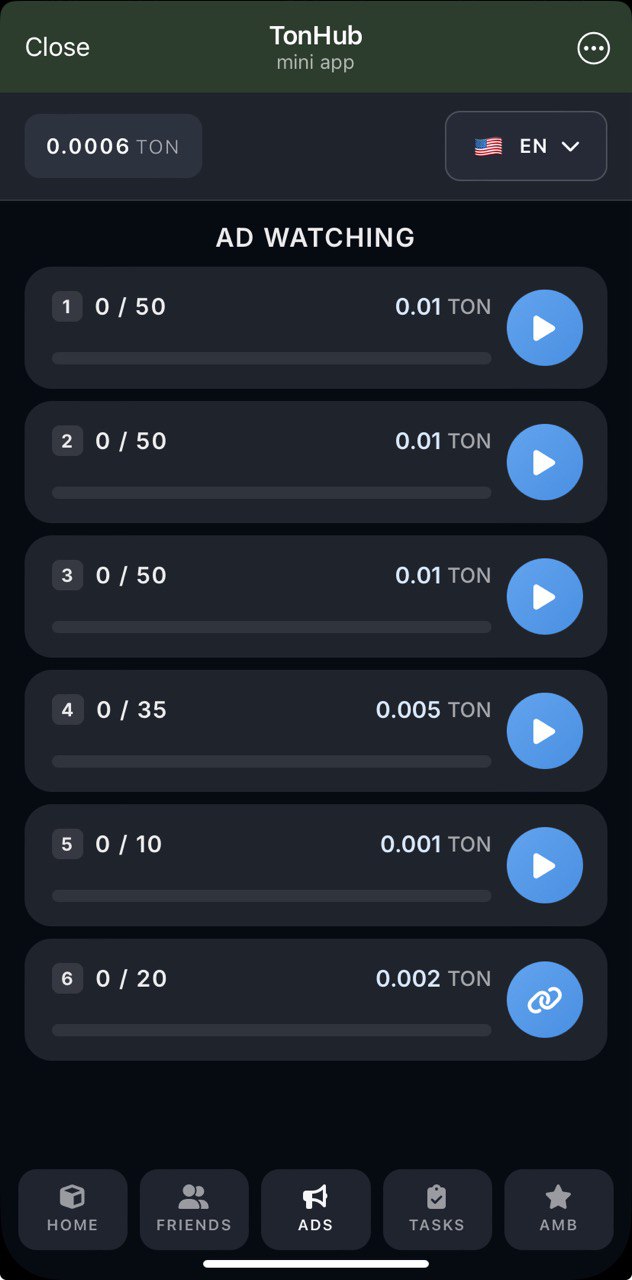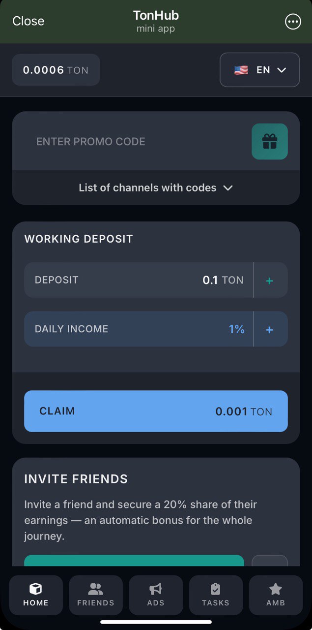 I feel a footprint of TonBank in this project: daily accruals, 6 ads sections, promocodes and some other things. These are the primary activities here, ads rewards are not quite large, but still possible a way to earn. Investing is always on your own risk, be careful.
