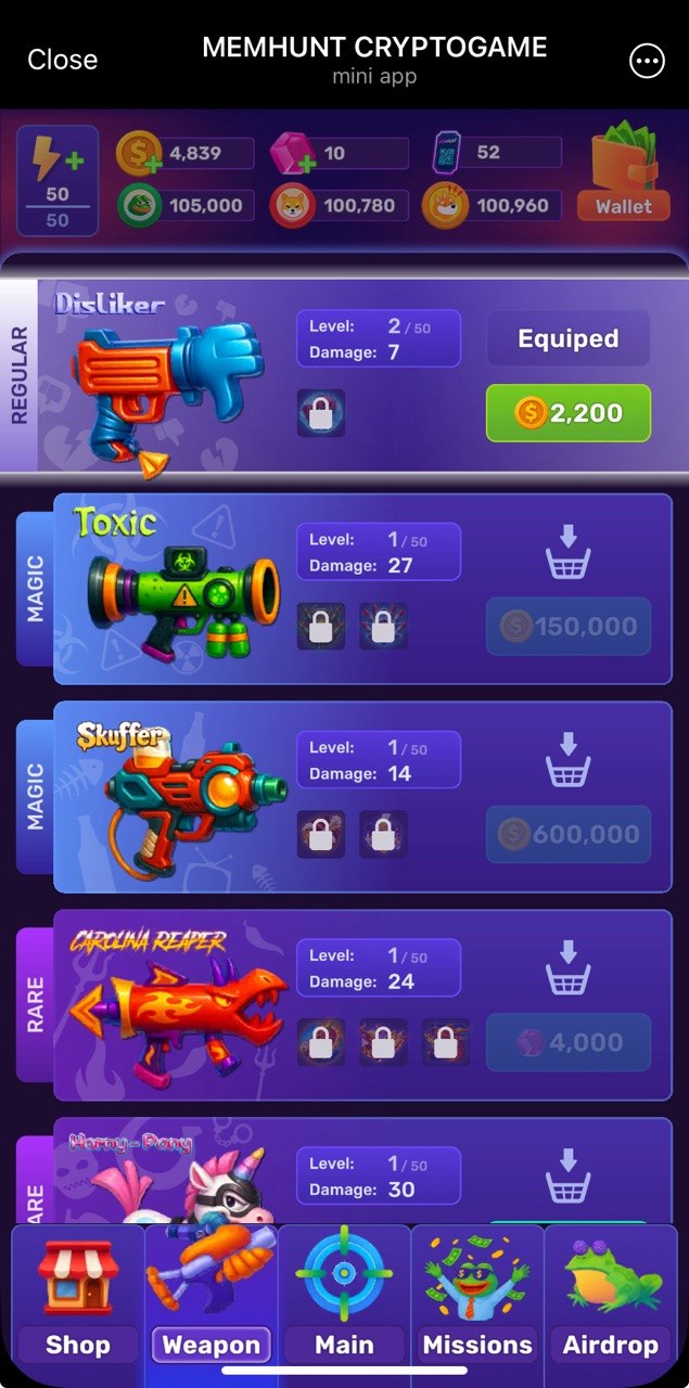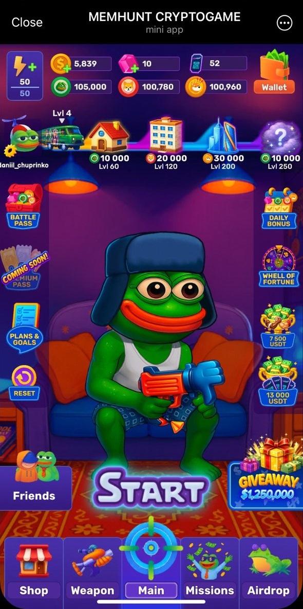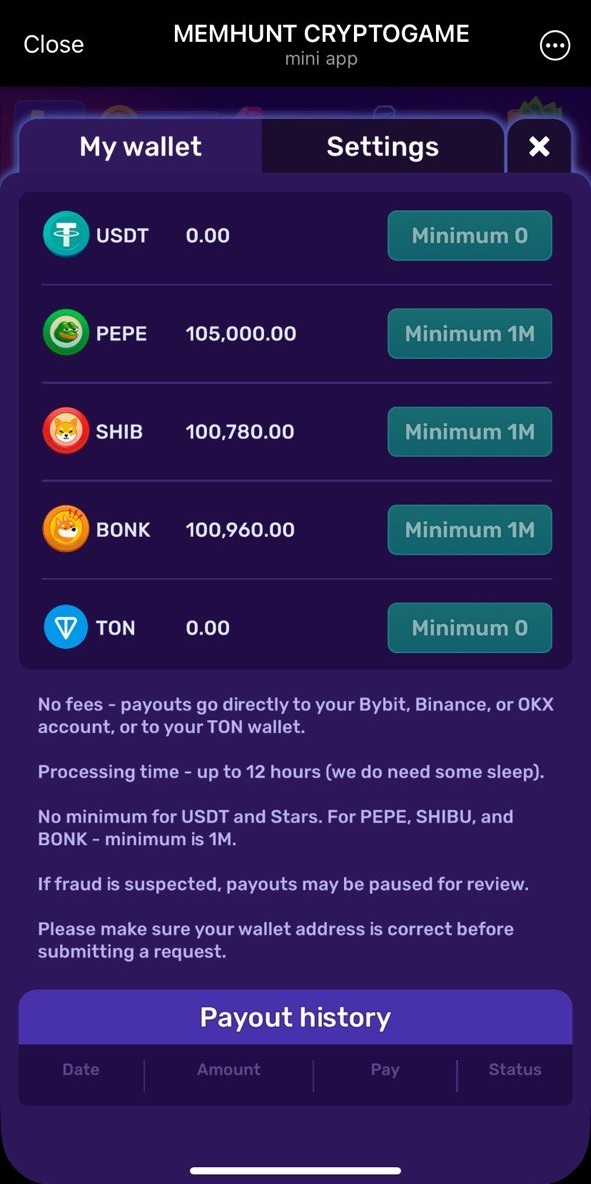 We have "Subway Surf"-like playstyle here: run, bust memes and collect tokens as you go đ App is not something new, but I've managed to reach it only now đ We farm $SHIB, $PEPE and $BONK by progressing through the game. Minimum withdrawals for each is 1 million. There is also possibility of MEMHUNT token airdrop in future, but we all know how this usually works đ