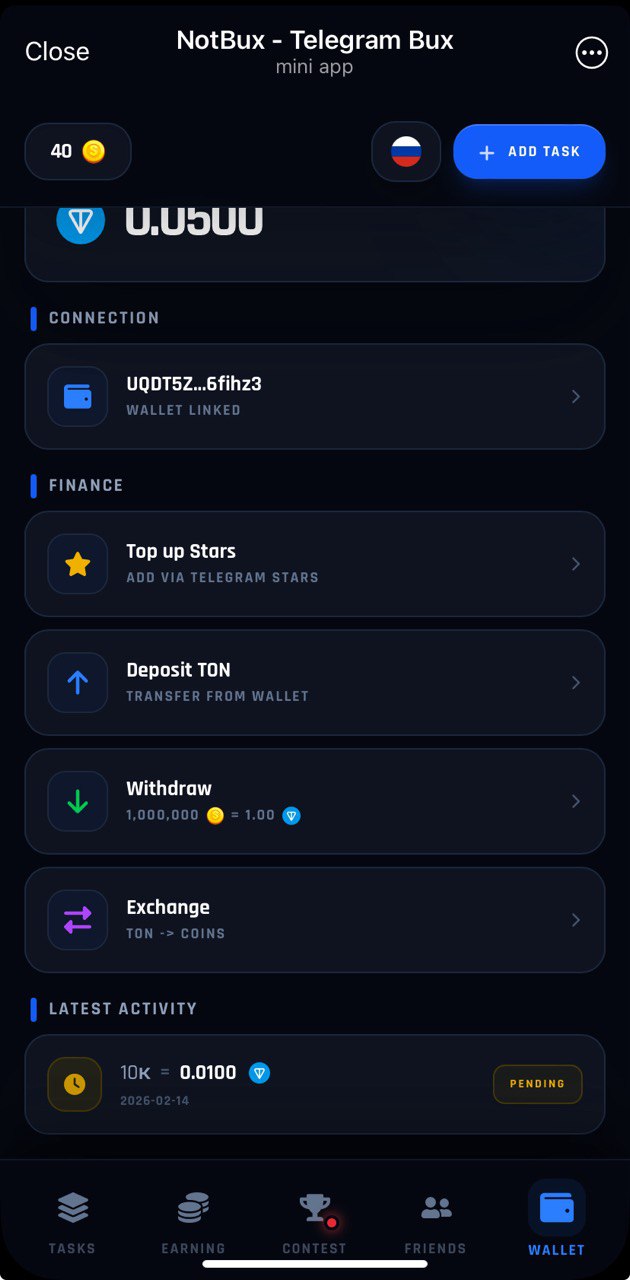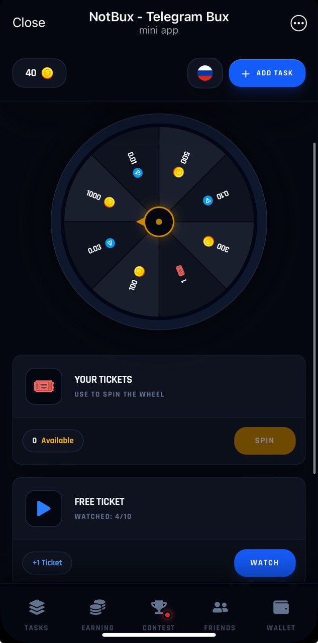 Classic bux based on Telegram platform: subscribe channels, launch bots and watch short ads to receive some coins (internal currency). After enough coins collected just swap them to $TON and withdraw.