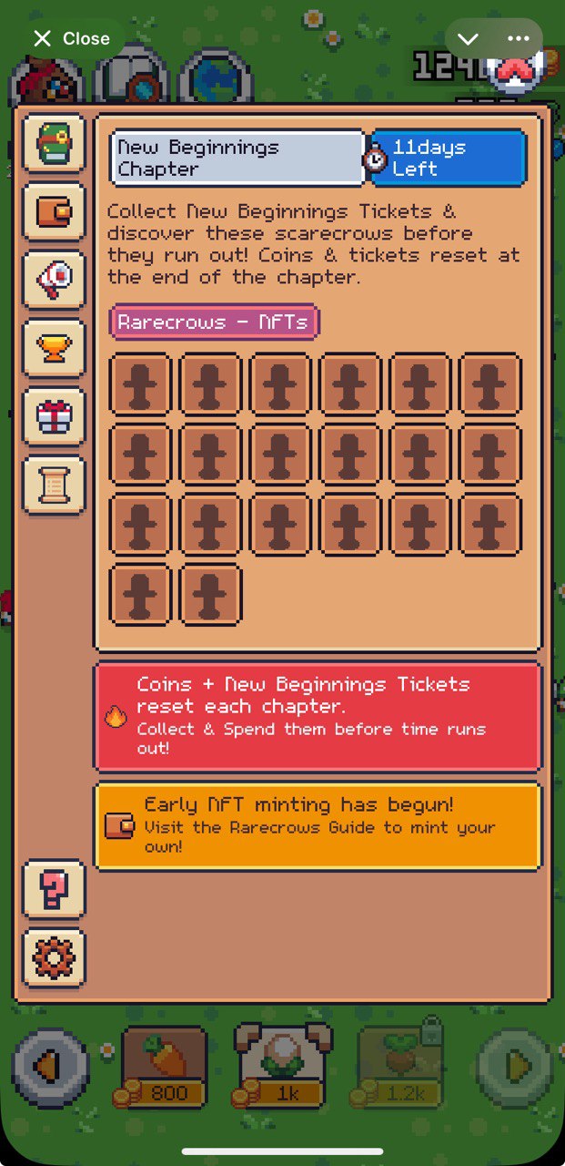 Clicker/tapper game focused at farming NFT scarecrows đ Time to put all pseudo-miners at pause and do some taps to get some best scarecrows. It is really that simple: farm crops, get tickets, open chests and maybe you'll get lucky to discover mintable NFT scarecrow đĨ