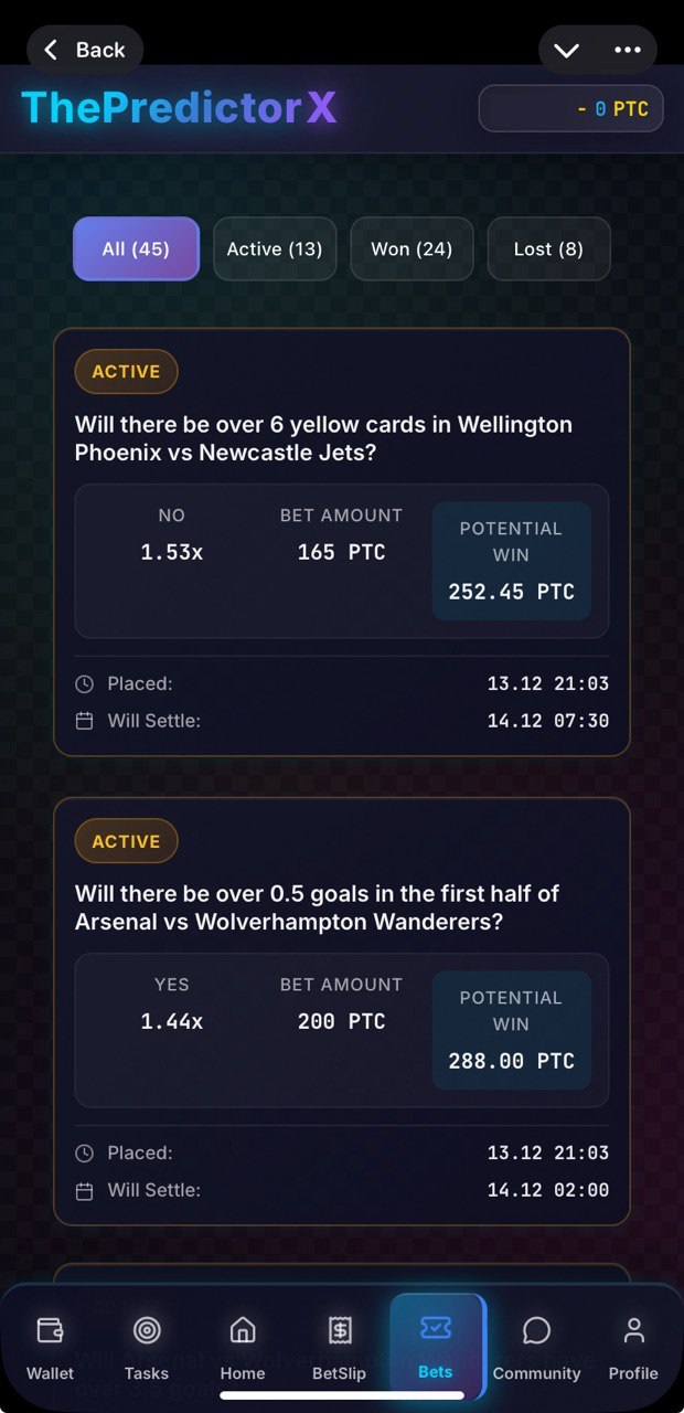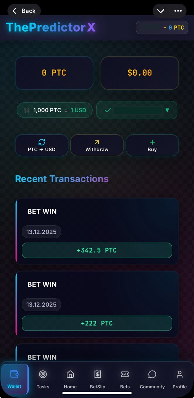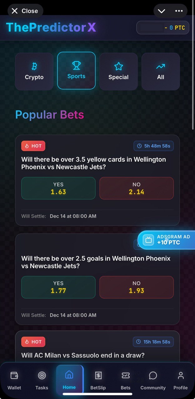 Despite I don't tolerate betting mechanics - here it is. Why? Two points: project allows you to earn for free and you use $PTC for placing your bets. $PTC is an internal project token which is to be brought to TGE (token generation event) in near future, here is link to the whitepaper. Free $PTC can be earned via doing simple tasks or classical ads watching. Betting is performed with Yes/No approach over provided list of events. $PTC can be swapped to $USDT directly in app and withdrawn aftewards. Or you can save $PTC for future listing at CEX/DEX.