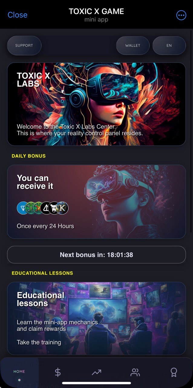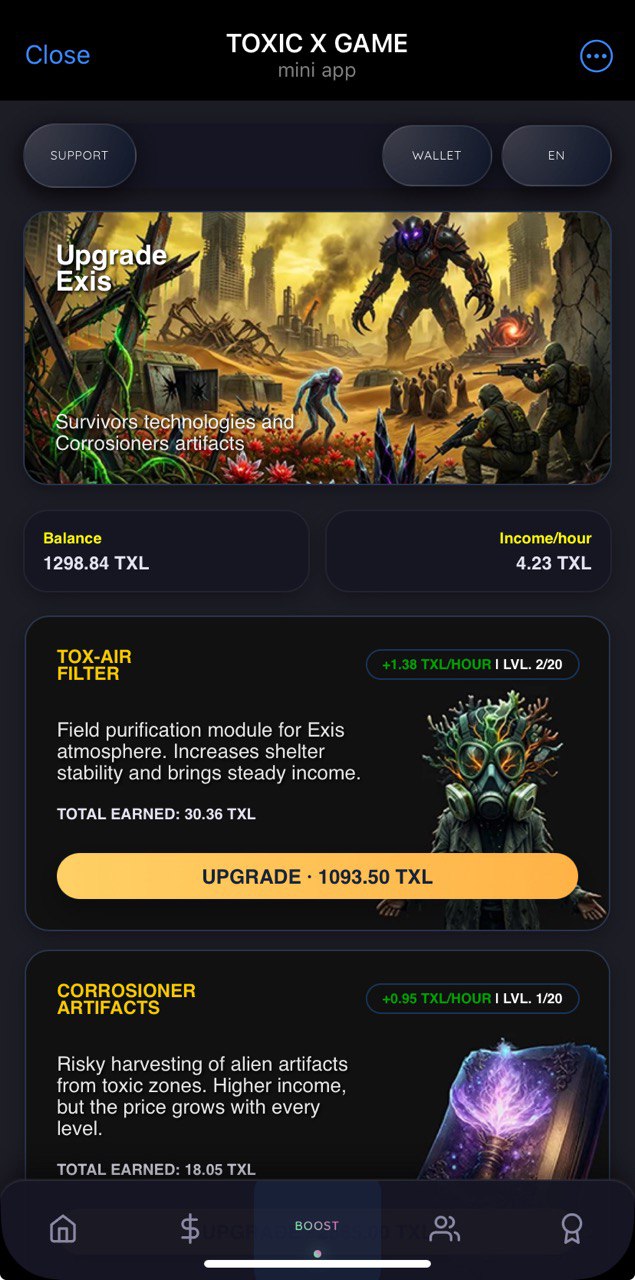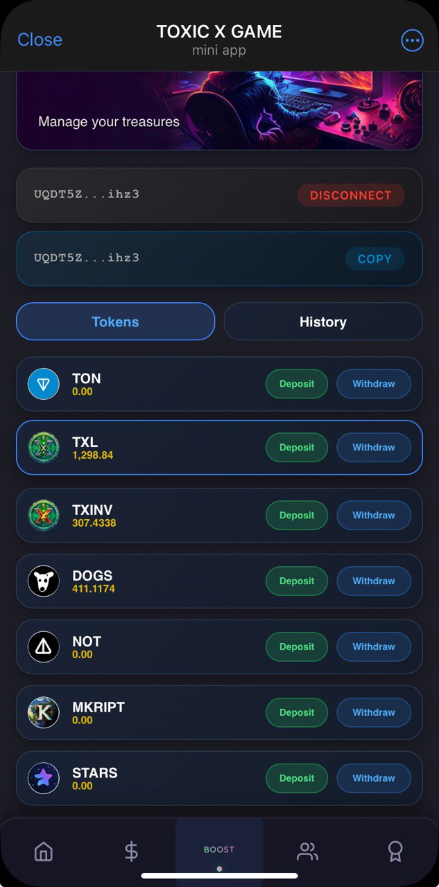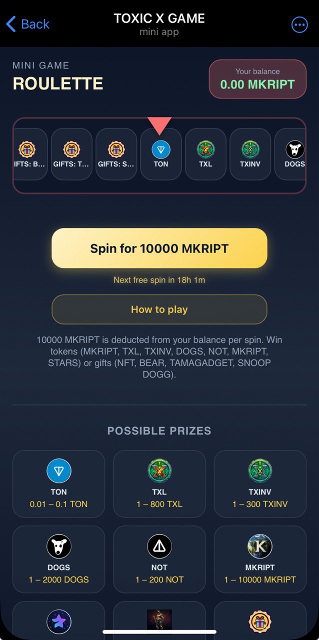 So, what do we do here? We farm some tokens π Collect free daily bonus: there is a little assortment of them, but $TXL and $TXINV are main tokens of the game and future ecosystem π Perform daily spins (free one is also included) to get even more tokens or some pretty gifts (with rather low chance, of course) π Purchase boosters for $TXL to farm even more $TXL π You can also purchase some NFT's which will farm $TONπ alongside with $TXL (I haven't tried that yet though)